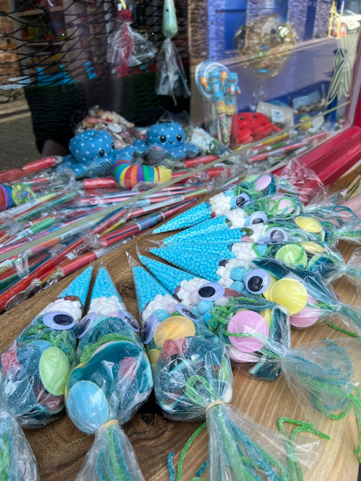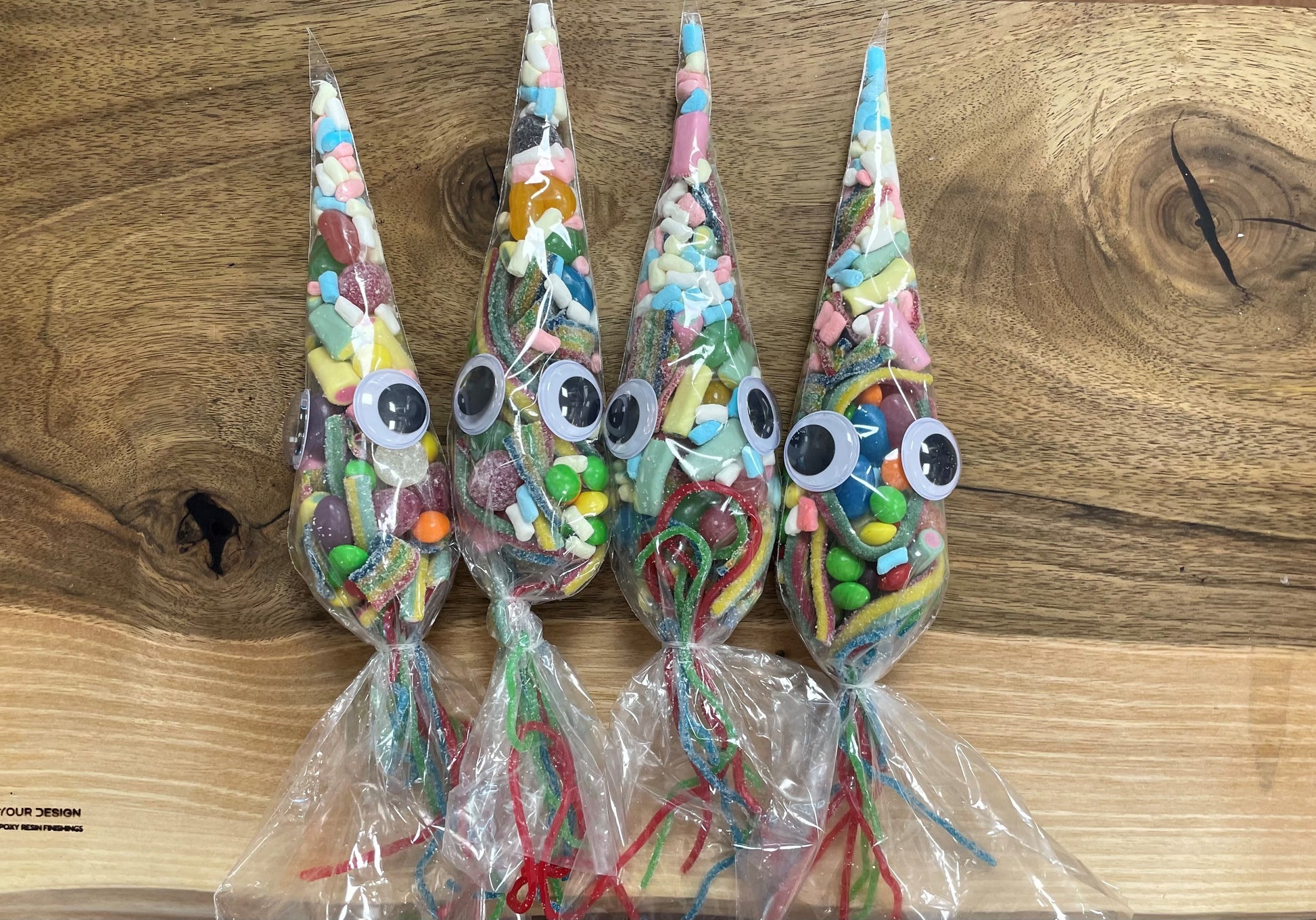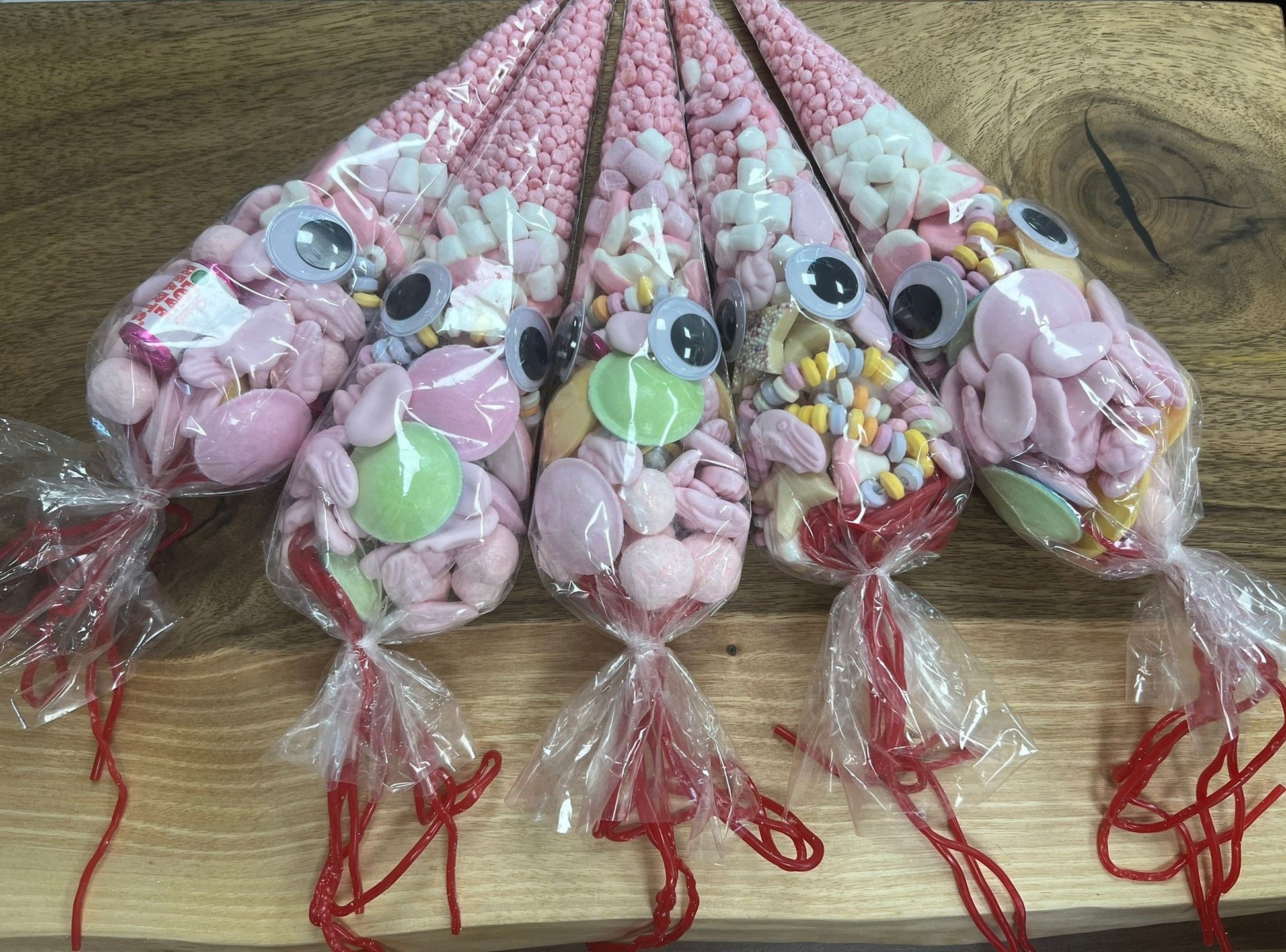 Our handmade squid bags are full of an assortment of delicious treats, including bonbons, millions, sugar laces, marshmallows, love hearts, candy bracelets, and more!