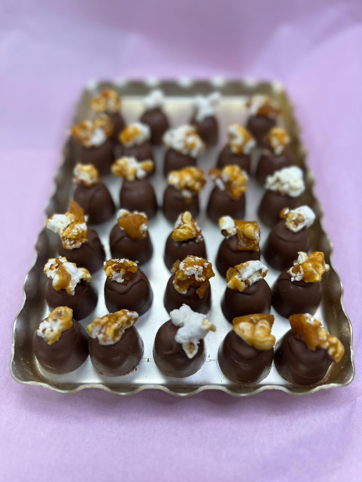 Milk Belgian Chocolate with Toffee infused with popcorn Ganache and Popcorn Topping